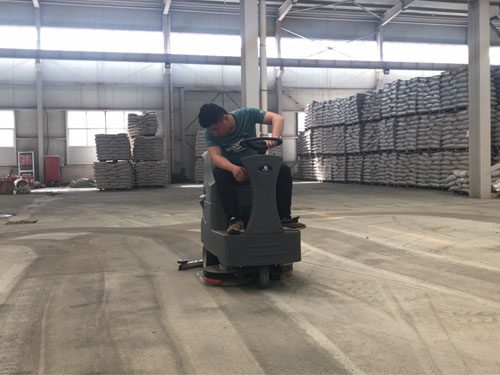 駕駛式洗地機(jī)在倉庫水泥地面上使用