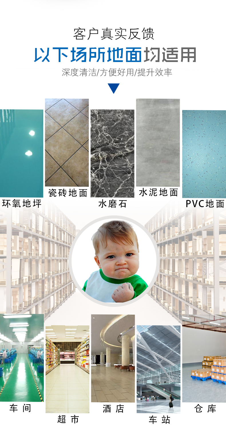 適用場(chǎng)所:商場(chǎng)超市、工廠車間、學(xué)校醫(yī)院、火車汽車站、物業(yè)地下車庫(kù)等,解決水泥地、瓷磚、環(huán)氧地坪、金剛砂等地面清洗
