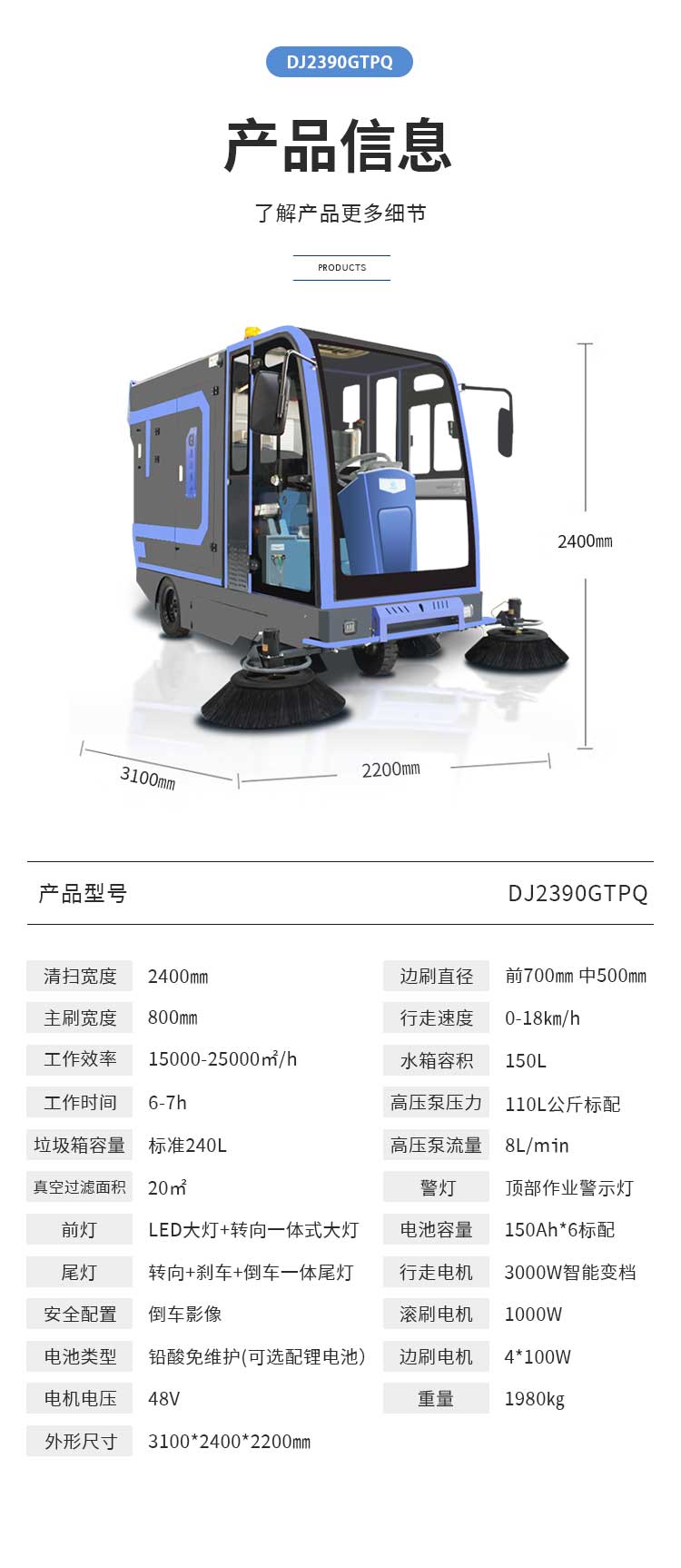 適用場(chǎng)所:配備倒車影像、液晶顯示屏、水箱報(bào)警器、整車烤漆工藝、驅(qū)動(dòng)電機(jī)3000W爬坡能力更強(qiáng)。