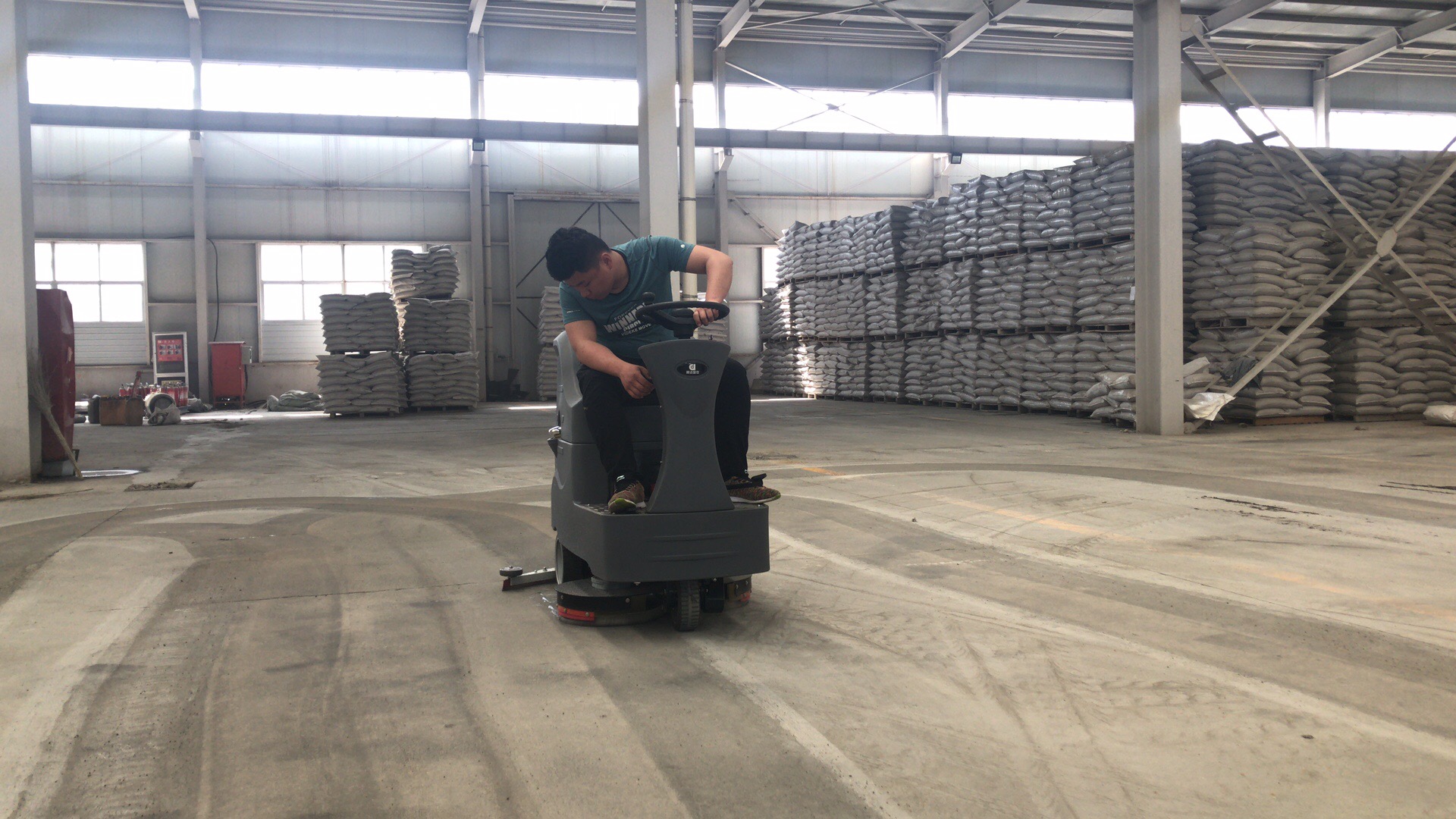 駕駛式洗地機(jī)在倉庫水泥地面上使用
