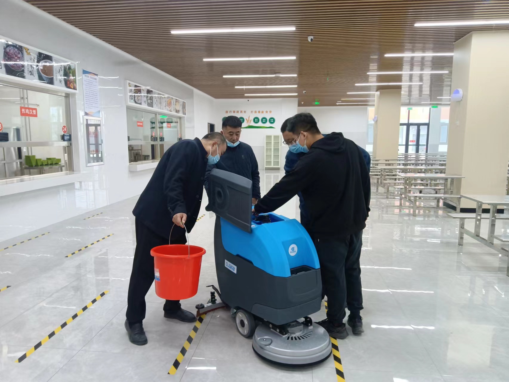 信發(fā)中學想選擇洗地機來代替人工打掃餐廳,給全校師生呈現(xiàn)整潔干凈的用餐環(huán)境。采購人員聯(lián)系到鼎潔盛世銷售經(jīng)理,經(jīng)過銷售經(jīng)理問完面積及地面情況后,給推薦了手推式洗地機:DJ530M特別適合餐廳的邊邊角角,尤其是餐廳還有桌椅,不好清洗地面,此款電動洗地車清水箱污水箱分體式設計,側(cè)翻式水箱,檢修方便,吸水膠條可以多面使用,有效節(jié)約成本。