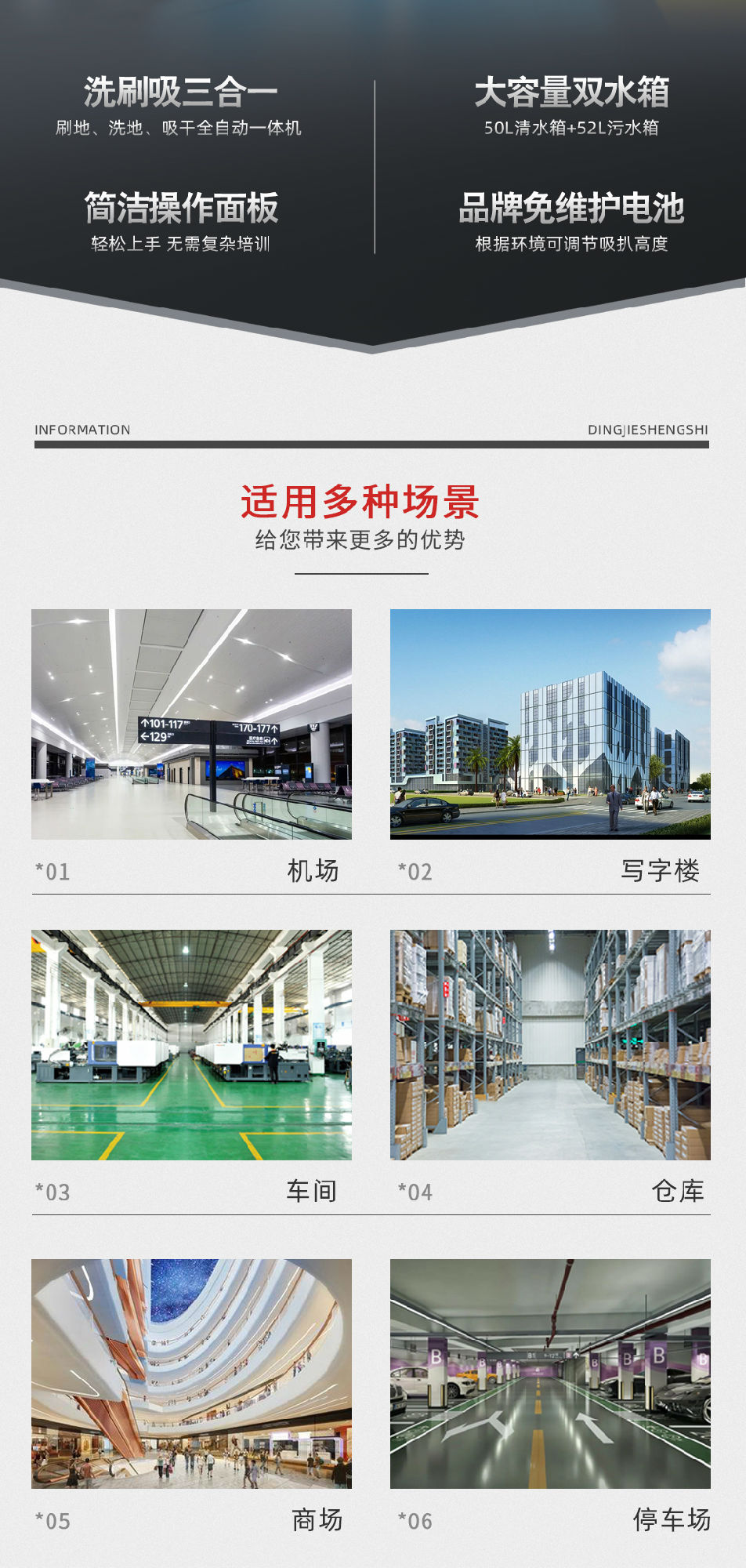 適用場所:商場超市、倉庫車間、學校醫(yī)院、火車汽車站、物業(yè)地下車庫等,解決水泥地、環(huán)氧地坪、金剛砂等地面清洗。